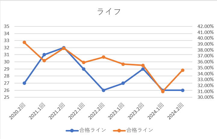 ライフの合格ラインは、30問/50問を越えた回が少なく、直近2回は26問/50問と最低値となっています。