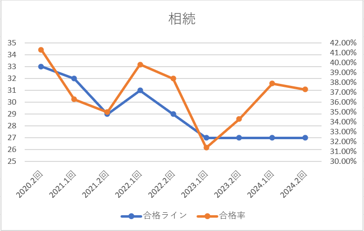 相続の合格ラインは、右肩下がりの傾向で、直近4回が最低値の27問/50問となっています。