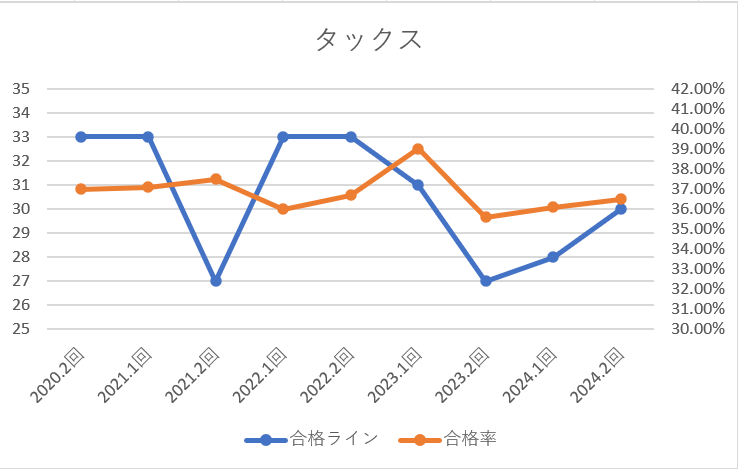 タックスの合格ラインは、2020年から2022年ごろまでは高めに推移していましたが、直近3回は低くなっています。