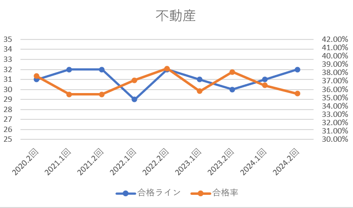不動産の合格ラインは、最高値の32問/50問の回が、過去9回中4回と高めに推移しています。