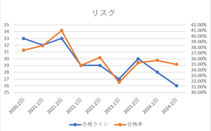 リスクと保険の合格ラインは、2022年第2回から合格ラインが下がるようになり、30問/50問を越えなくなっています。