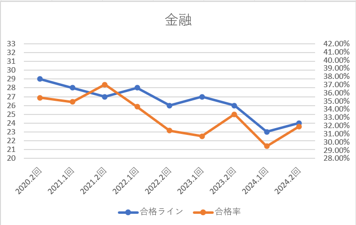 金融のみ合格ラインと合格率の目盛りが20~33と28%~42%となっています。