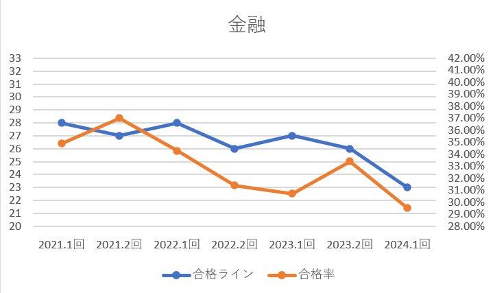- 金融は合格ライン、合格率ともに過去7回で一番低かった。