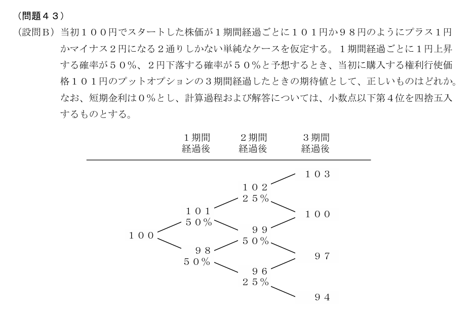 | 大問11(5~6問) | デリバティブやその他金融商品 | 投資戦略について オプションの3期間経過後の期待値は頻出 |