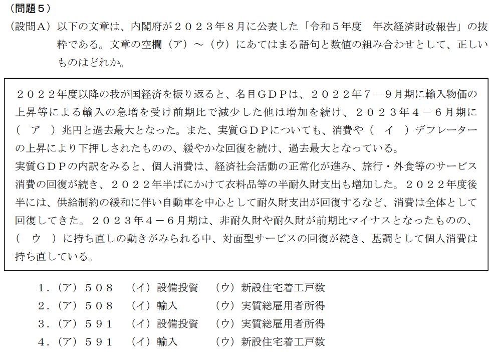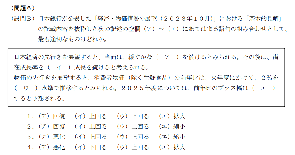 2024年度第2回では、問題6で空欄に当てはまる語句の正しい組み合わせを選ぶ問題が出題されました。
