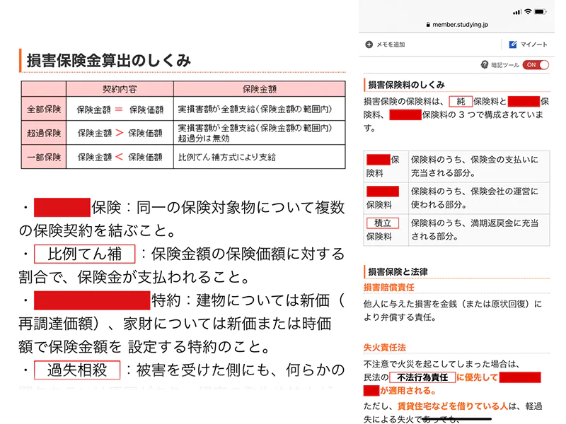 要点まとめシートは、覚えるべきところが暗記ツールで隠れるようになっています。